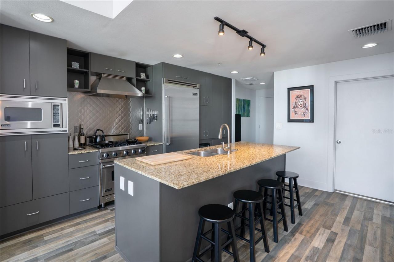 Welcome to Grand Central at Kennedy - where elevated living meets the energy of downtown. Perfectly positioned in the heart of Tampa, this premier address offers immediate access to Water Street, Channelside, top-rated restaurants, vibrant nightlife, major employers, and Amalie Arena for unforgettable hockey nights and events.Grand Central sets the standard for urban luxury with resort-style amenities including: two swimming pools, two private doggie play areas, an impressive fitness studio, an onsite restaurant & bar, and the ground floor is Crunch Fitness. Even the location of the main elevator drops you off steps from Publix, pickleball courts, and a community dog park!Unit 832 offers a rare and highly desirable top-floor corridor location with only two neighboring residences - creating an exclusive, private feel. Enjoy the convenience of what feels like your own private elevator access and a premium parking space just steps from your front door.Inside, penthouse-style views and modern upgrades define the space. Luxury vinyl plank flooring runs throughout, complemented by refinished cabinetry, granite countertops, and a sophisticated contemporary color palette.The chef-inspired kitchen is equipped with Viking stainless steel appliances, including a 5-burner gas range, refrigerator, and built-in microwave - designed for both entertaining and everyday indulgence.The spacious primary suite comfortably accommodates a king-sized bed, features a walk-in closet, and offers a beautifully updated three-piece en-suite bath with a newer vanity and upgraded flooring.Unlike many units in the building, this condo includes a dedicated laundry closet with washer and dryer that convey with the sale. A private-temperature controlled storage facility accompanies the condominium securing your items without cluttering the condo.Step outside to your full-length private balcony spanning the width of the unit, offering stunning views of the city skyline, water, and the pool - the perfect blend of vibrant urban energy and a peaceful retreat.If you're seeking a residence that delivers convenience, fitness, entertainment, and refined city living all in one address, Grand Central is where your search begins. For those who expect VIP-level living with every big-city perk, Unit 832 delivers.Schedule your private showing today.